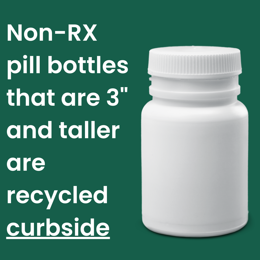If you have non-rx plastic bottles, please recycle curbside (so long as they are 3 inches or taller). Over the counter non-rx pill bottles (any number) that are 3” or smaller may be recycled at the Hub.